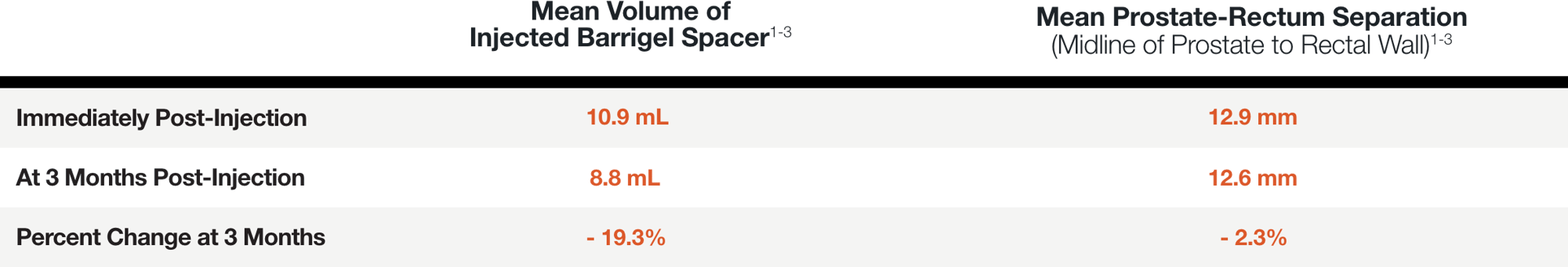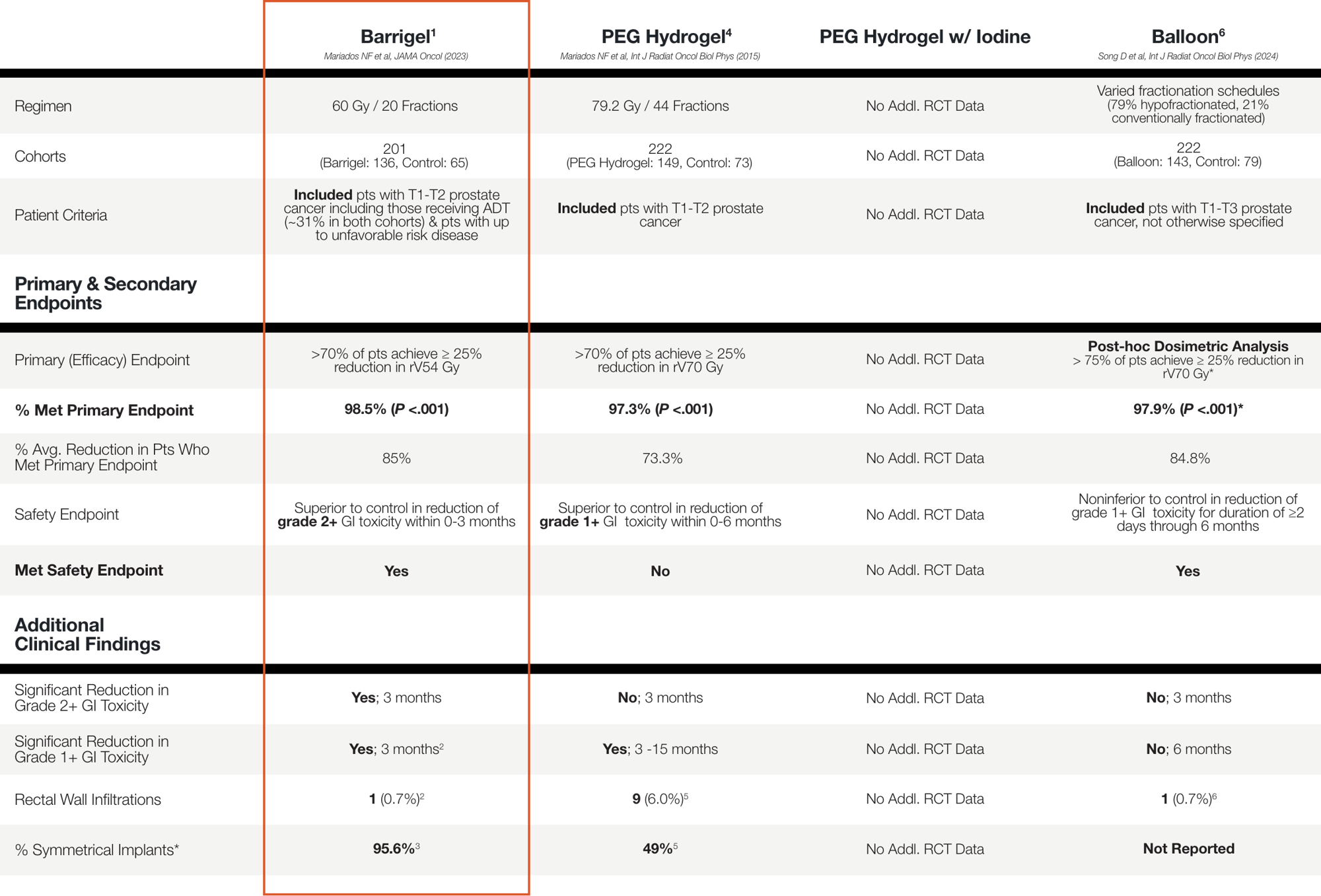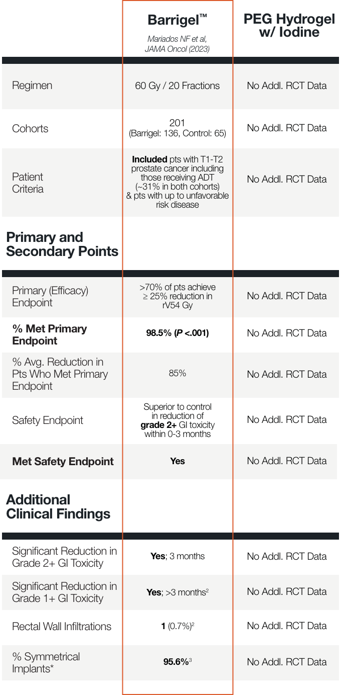 † In a separate, directly analogous secondary analysis of data from the Barrigel pivotal trial, Barrigel symmetry results were compared to those of SpaceOAR, as reported in Fischer-Valuck BW et al. Pract Radiat Oncol (2017), using the same methodology used in that study. Information provided for educational purposes only. No head-to-head study has been performed. Results from different clinical studies are not directly comparable.