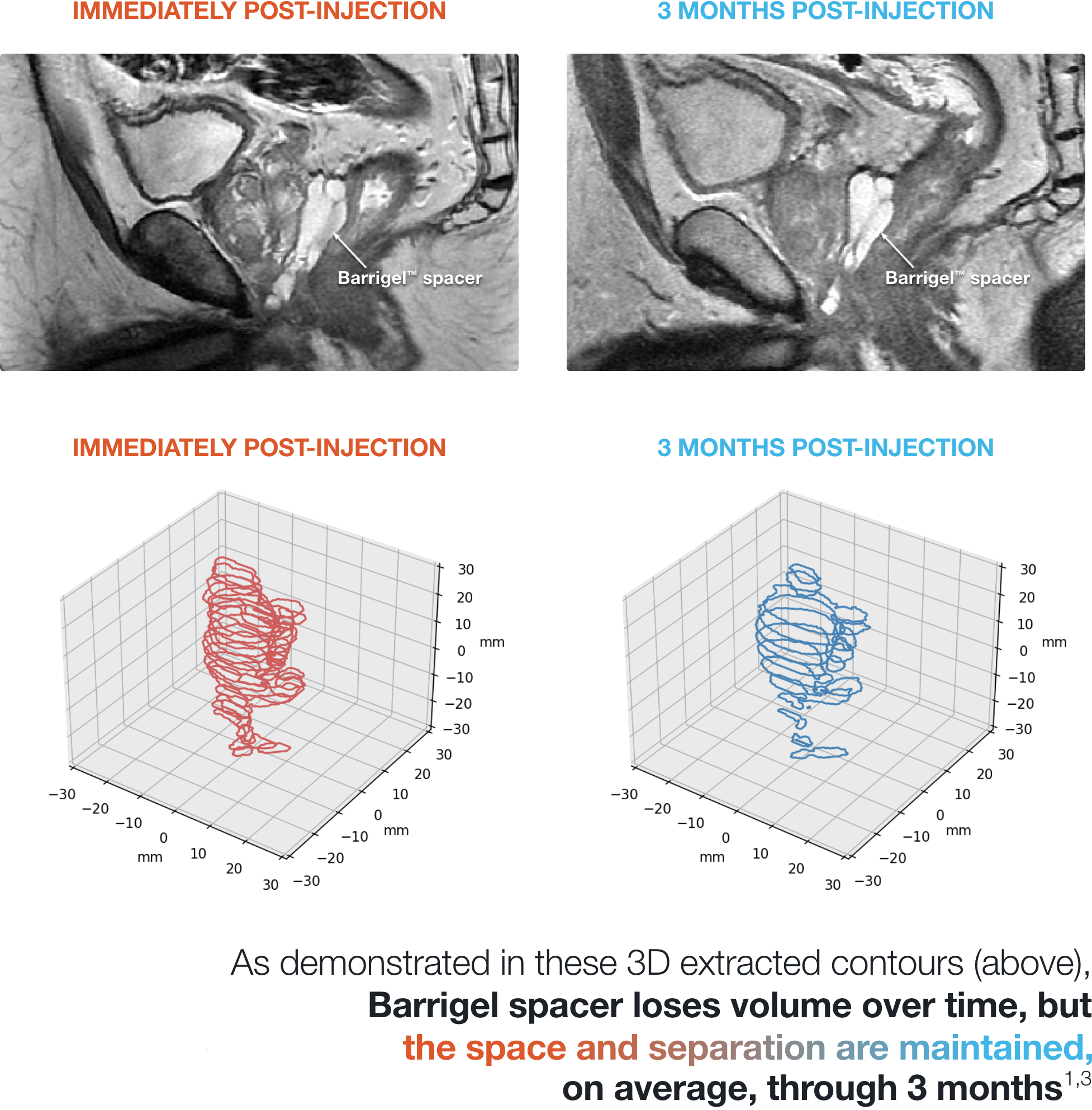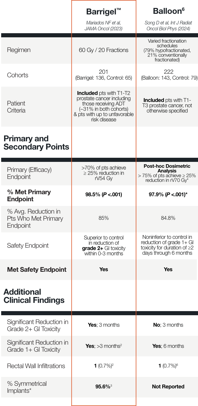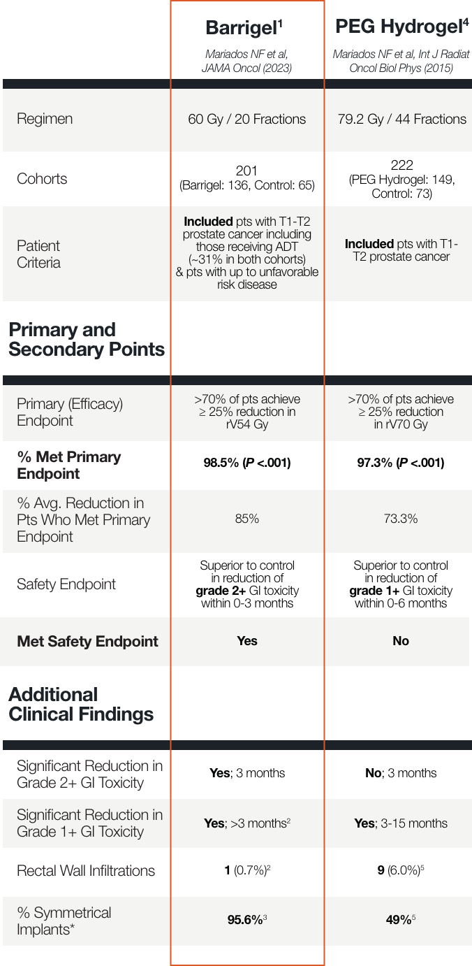 ** In a separate, directly analogous secondary analysis of data from the Barrigel pivotal trial, Barrigel symmetry results were compared to those of SpaceOAR, as reported in Fischer-Valuck BW et al. Pract Radiat Oncol (2017), using the same methodology used in that study. Information provided for educational purposes only. No head-to-head study has been performed. Results from different clinical studies are not directly comparable.